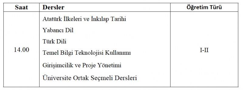 Üniversite Ortak Dersleri de yukarıdaki programa uygun şekilde yapılacaktır.