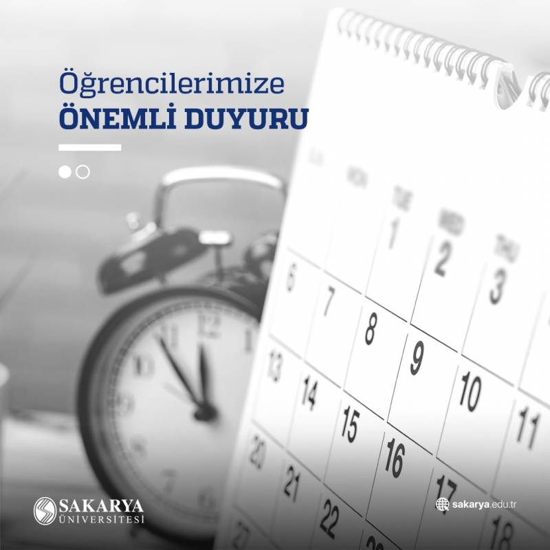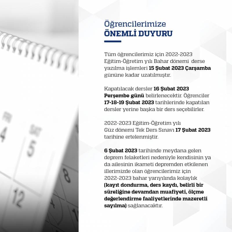 Tüm öğrencilerimiz için 2022-2023 Eğitim-Öğretim yılı bahar dönemi derse yazılma işlemleri 15 Şubat 2023 Çarşamba gününe kadar uzatılmıştır. Kapatılacak dersler 16 Şubat 2023 Perşembe günü belirlenecek olup öğrenciler 17-18-19 Şubat 2023 tarihlerinde kapatılan dersler yerine başka bir ders seçebilir. 2022-2023 Eğitim-Öğretim yılı Güz dönemi Tek Ders Sınavı 17 Şubat 2023 tarihine ertelenmiştir.