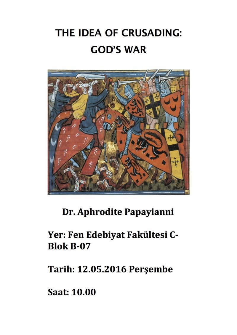 Erasmus Personel Hareketliliği kapsamında bölümümüzde bulunan Birkbeck, University of London öğretim üyelerinden Dr. Aphrodite Papayianni, 12 Mayıs 2016 Perşembe Günü Fen-Edebiyat Fakültesi C Blok B07 Nolu Amfi'de "The Idea of Crusading: God's War" başlık bir seminer verecektir.