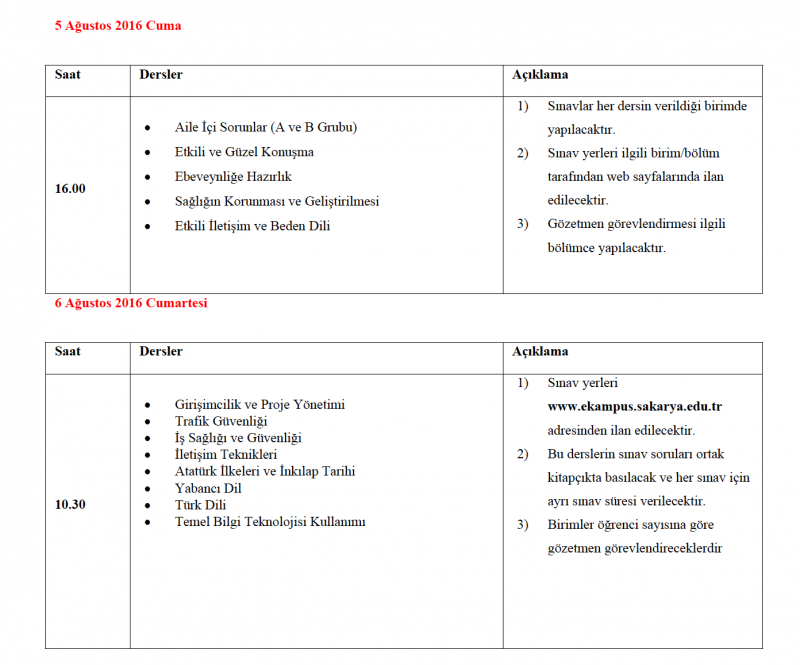 Mazeret Sınavları – 8 – 9 Ağustos 2016